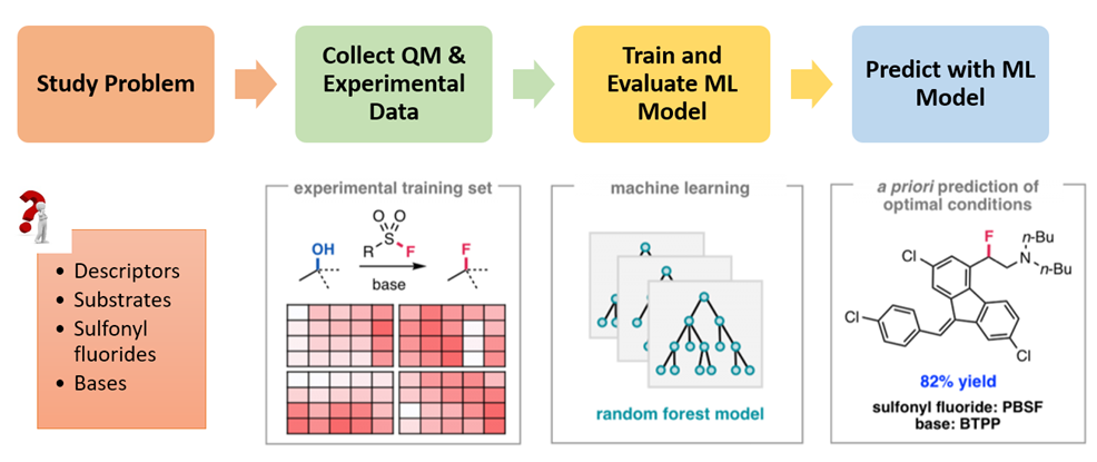 如何在众多脱氧氟化条件中,快速的寻找到最优反应条件呢?2018年,普林斯顿大学的Abigail G. Doyle教授报道,将Quantum Mechanics(QM)和机器学习(Machine Learning:ML)相结合,构建一个可靠的QM-ML模型,可以快速预测脱氧氟化反应的最优条件[4]。