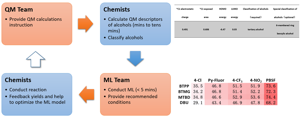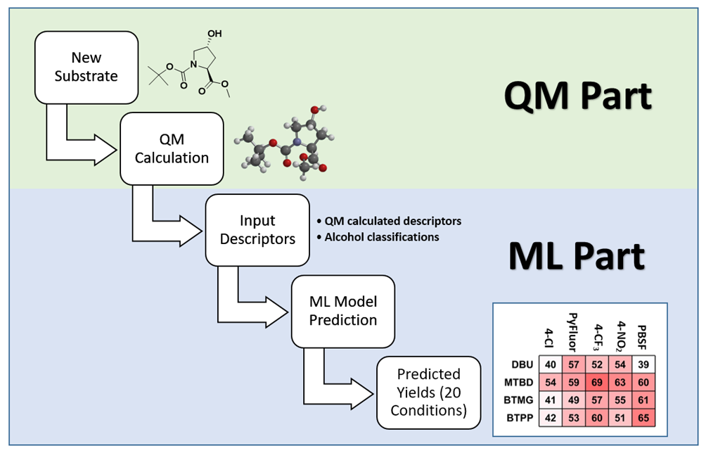 图2是应用QM-ML脱氧氟化反应模型进行预测的流程。首先通过QM计算出醇类反应底物的HOMO和LUMO能量,以及与羟基相连碳的静电电荷和暴露面积。将以上4个数据以及醇的分类信息输入到QM-ML模型中,仅需要几秒钟,就可以预测底物在20个不同反应条件下的收率。一个相对简单的预测流程!