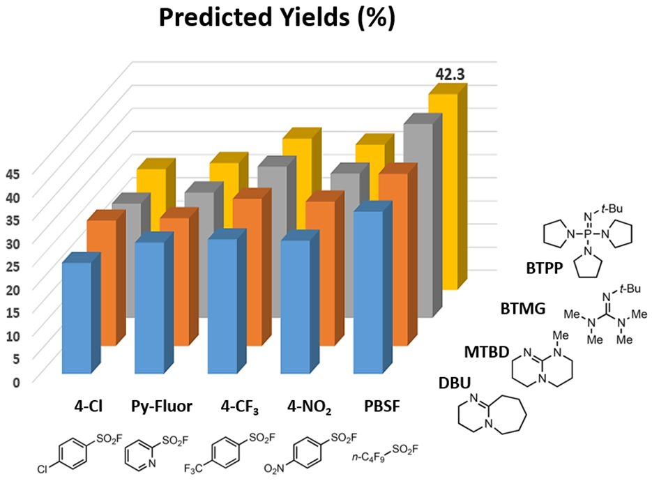 通过QM-ML脱氧氟化模型计算,给出了如下20种条件的预测结果。最优条件为PBSF和BTPP的组合,预测收率为42.3%。