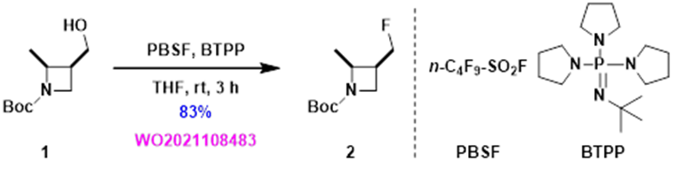 含氟有机化合物对药物开发具有很高的价值[1],脱氧氟化反应是将醇转化为脂肪族氟化物的重要方法。目前已经发展了多种脱氧氟化试剂,其中最常用的是DAST,但DAST热稳定性差且易爆炸。近年来发展了一系列新型的脱氧氟化试剂,如: PyFluor [2]和AlkylFluor[3]。同时碱的选择在该反应中也非常重要,如PyFluor和DBU是链状仲醇脱氧氟化反应的最佳组合,能最大程度减少消除副产物的生成[2]。
