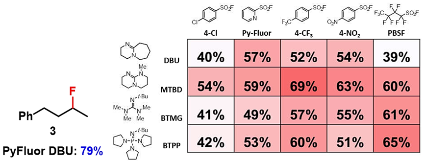 Doyle课题组通过QM-ML脱氧氟化模型为30多种醇找到了最优反应条件,包括活性醇(苄醇,烯丙醇),非活性的醇,链状醇,环状醇等。对于非环状的二级醇,如化合物3,ML预测的最优条件是4-CF3PhSO2F和MTBD的组合,收率为69%。但实验的最优条件是PyFluor和DBU的组合[2, 4]。所以ML预测的结果和实验情况有时会存在误差。