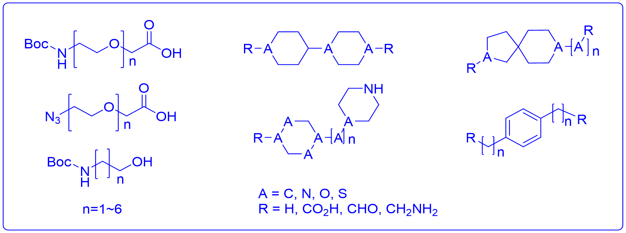 常用的linker: 超过300种常用linker(PEG, alkyl, ”clickable”, rigid等),可从览博网(https://www.labnetwork.com.cn)轻松获取